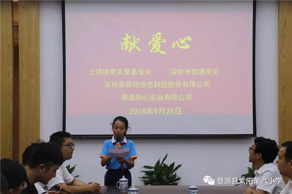 上饶市饶商关爱基金会、深圳市婺源商会、深圳菲普特信息科技股份有限公司、婺源县同心实业有限公司此次向紫阳六小捐赠课桌椅爱心款项共6万元。上饶市饶商关爱基金会项目部部长汤泽宇,深圳市婺源商会秘书长潘金海,婺源县同心实业有限公司总经理、县慈善会副会长王逃生先后发言:儿童是祖国的未来,希望我们的点滴爱心与温暖,能够帮助紫阳六小解决实际困难,更希望青少年儿童能够发奋图强,好好学习,为祖国做出贡献。