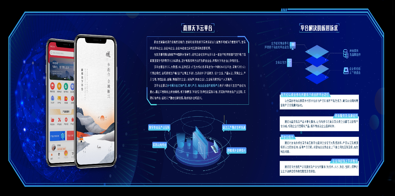 商邦天下云平台采用F2B2b2c的商业模式,融合5G、大数据、AI、区块链及IoT五大核心技术,以乡村振兴名优特产品、全国各地市礼产品、商会会员优质产品IP孵化和生态产业链打造为内容,通过整合全国线上商会网络、线下旗舰店(体验馆)及全流程供应链服务,让全国各地商会及会员企业能够足不出户、快速便捷地享受到具有上饶特色且优质的农产品及地方产品,让全国各地商会及会员企业能够通过优质的产品服务更深刻了解美丽上饶的浓厚文化底蕴及城市实力。