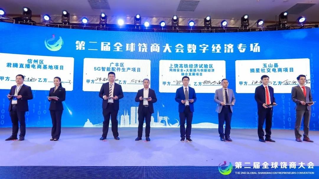 会上,信州区、广丰区、上饶高铁经济试验区、玉山县弋阳县、德兴市、婺源县、余干县等8个县(市、区)签约数字经济项目16个,总投资总额29.3亿元,涵盖数字文娱、数字营销、数字呼叫、网络直播、电子商务、智能终端制造、智慧城市建设等多个领域。